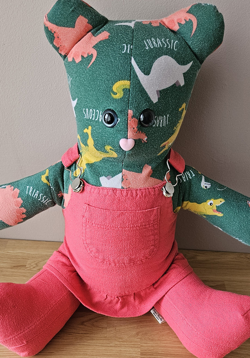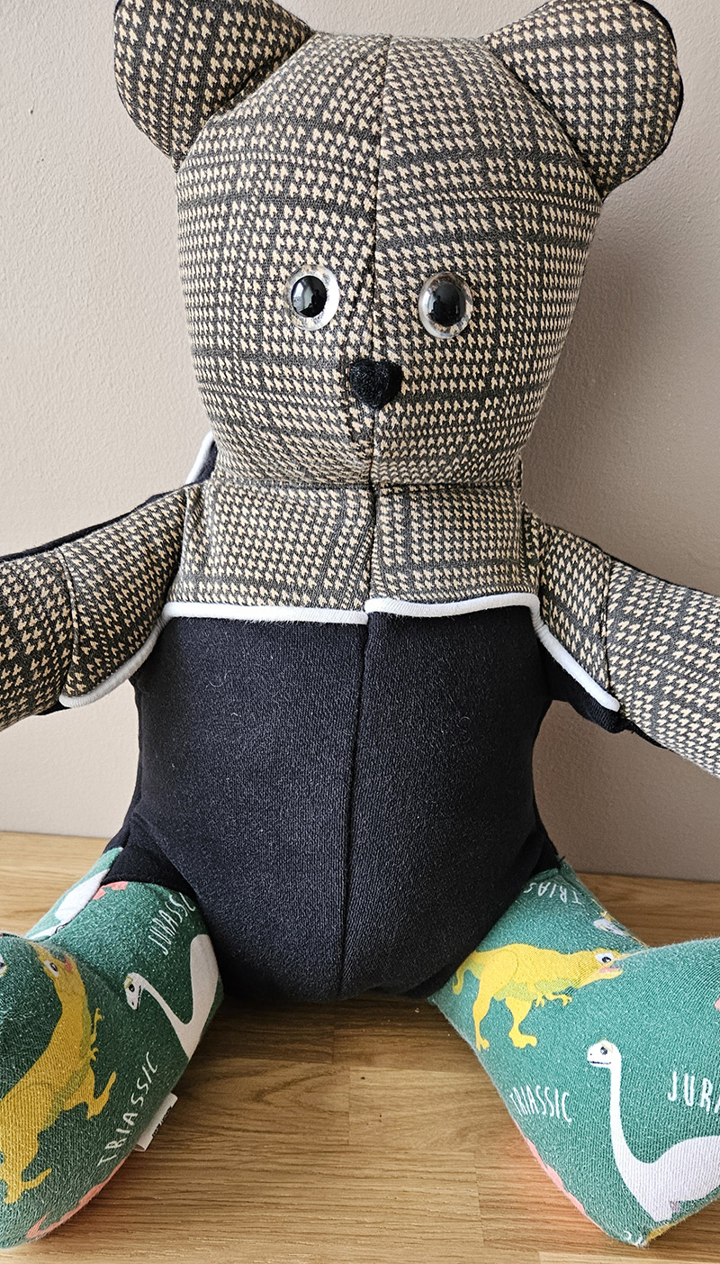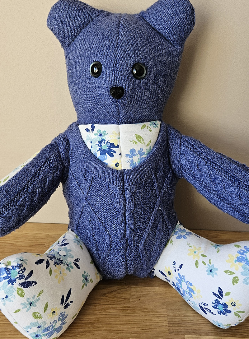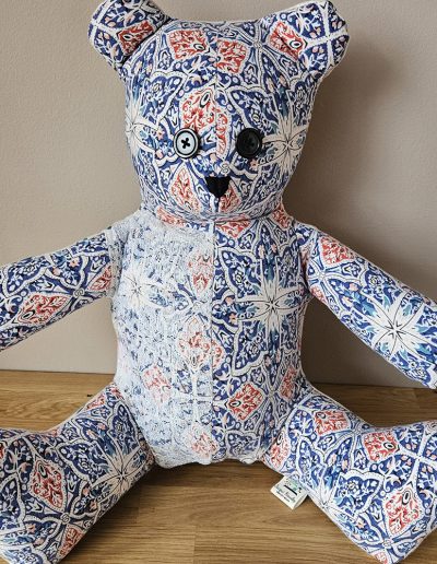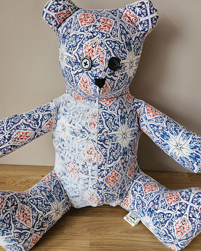 A small, independent business where every bear is crafted with love and care from my home studio in Devon. I take pride in offering a uniquely personalised service, working closely with each customer to capture the memories held within their chosen fabrics. Whether you’re local and want to sit down with me over a coffee to discuss your bear, or connecting from afar, I’m here to listen to your stories and honour what these fabrics mean to you.